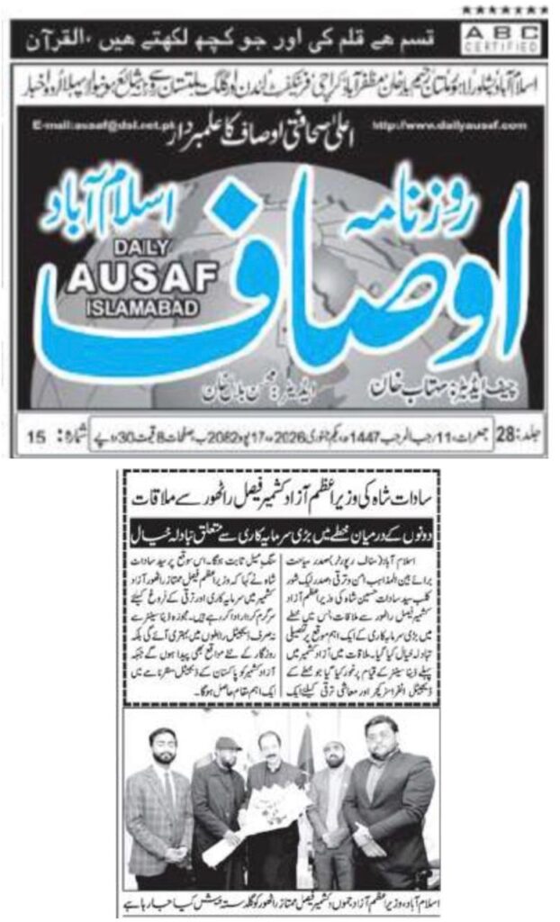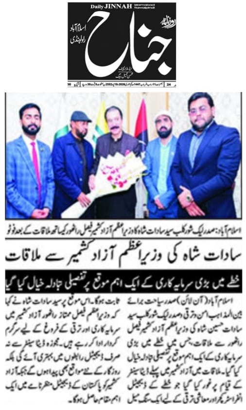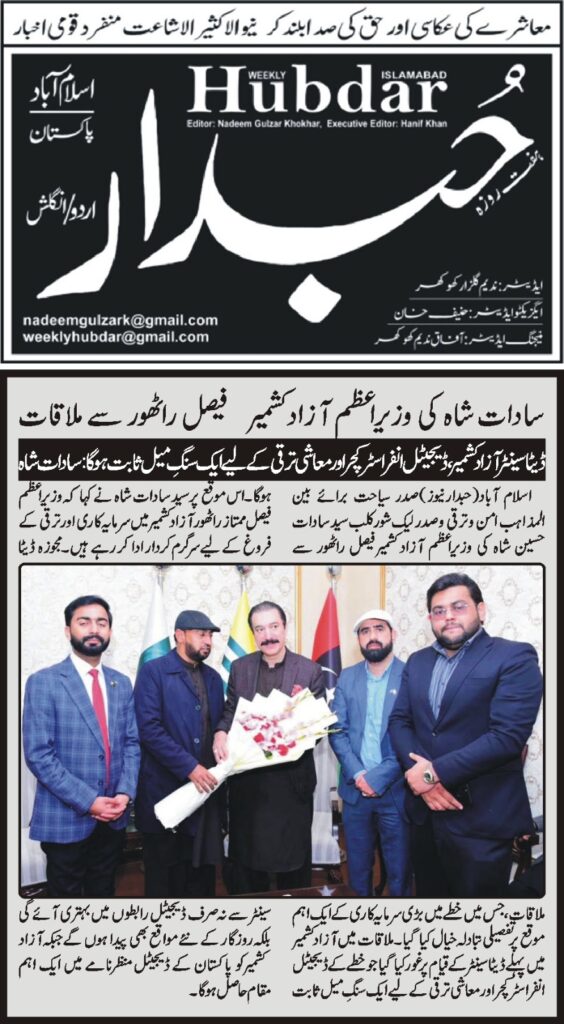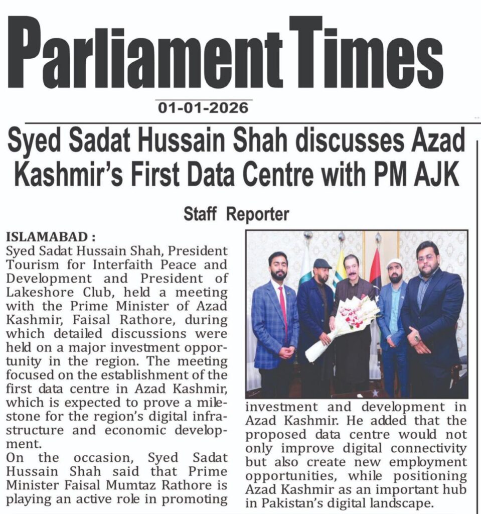 Syed Sadat Hussain Shah, President Tourism for Interfaith Peace and Development and President Lakeshore Club, held a meeting with the Prime Minister of Azad Kashmir, Faisal Rathore, during which detailed discussions were held on a major investment opportunity in the region. The meeting focused on the establishment of the first data centre in Azad Kashmir, which is expected to prove a milestone for the region’s digital infrastructure and economic development.