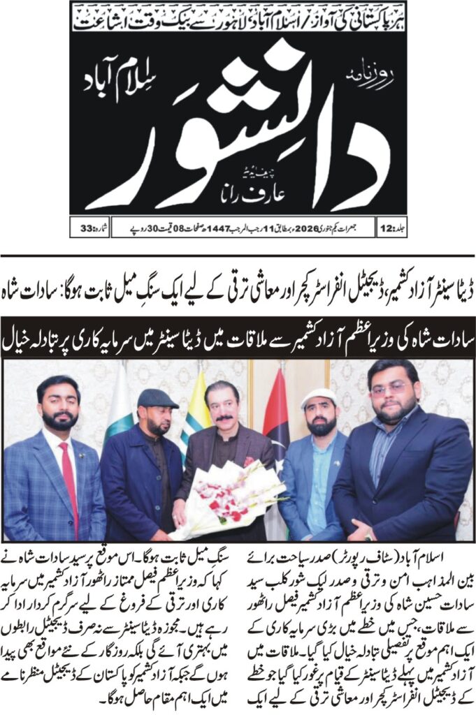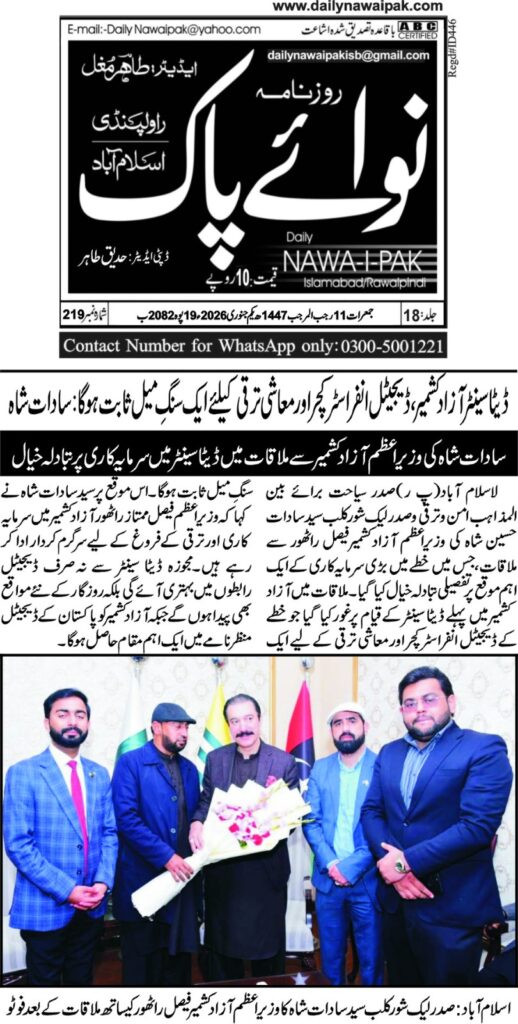 On the occasion, Syed Sadat Hussain Shah said that Prime Minister Faisal Mumtaz Rathore is playing an active role in promoting investment and development in Azad Kashmir. He added that the proposed data centre would not only improve digital connectivity but also create new employment opportunities, while positioning Azad Kashmir as an important hub in Pakistan’s digital landscape.