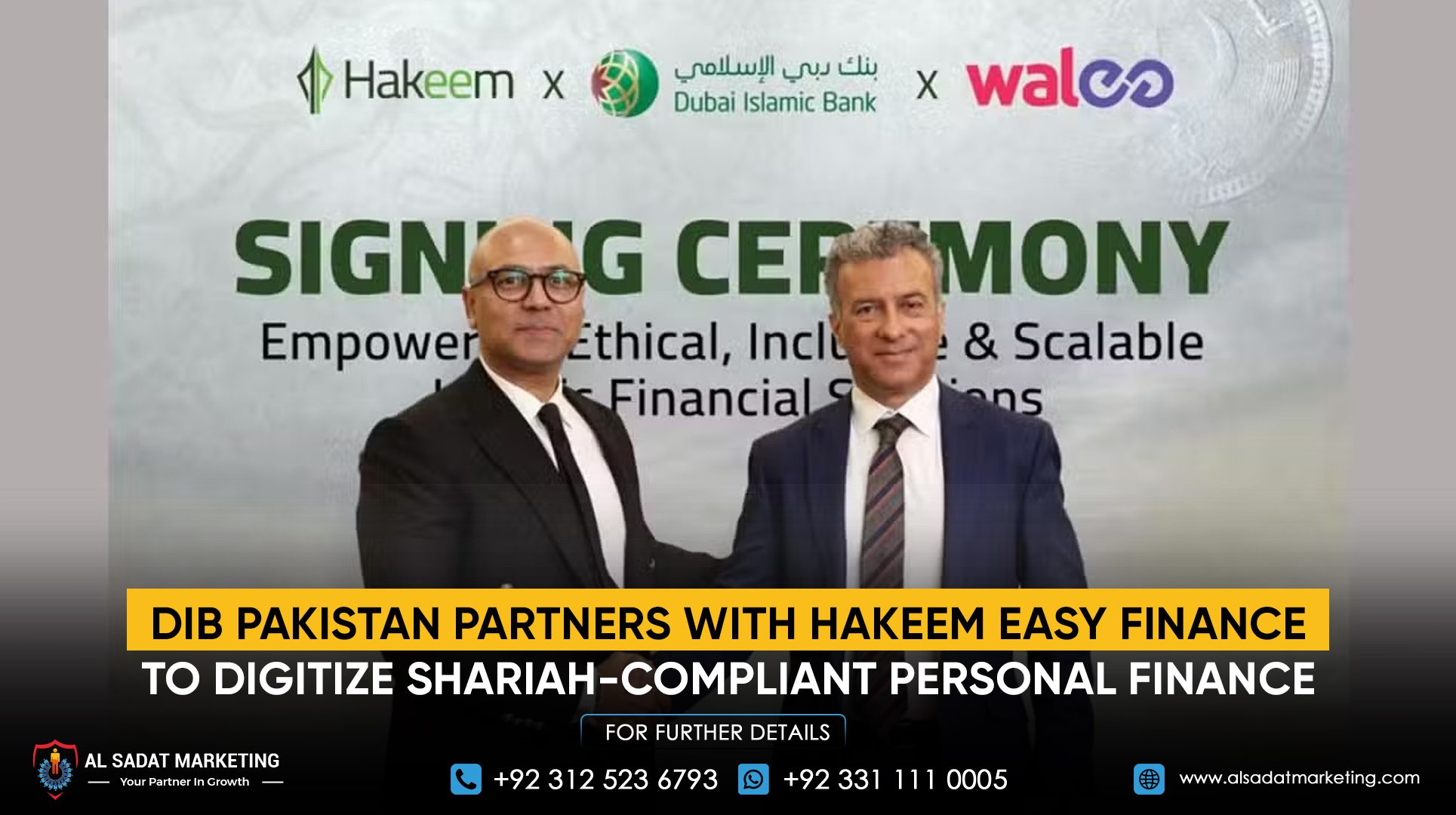 In a major development for Islamic banking, Dubai Islamic Bank Pakistan (DIB Pakistan) has signed a strategic partnership with Walee Financial Services (WFS), the company behind Hakeem Easy Finance, to digitize its Shariah process for its personal finance portfolio.