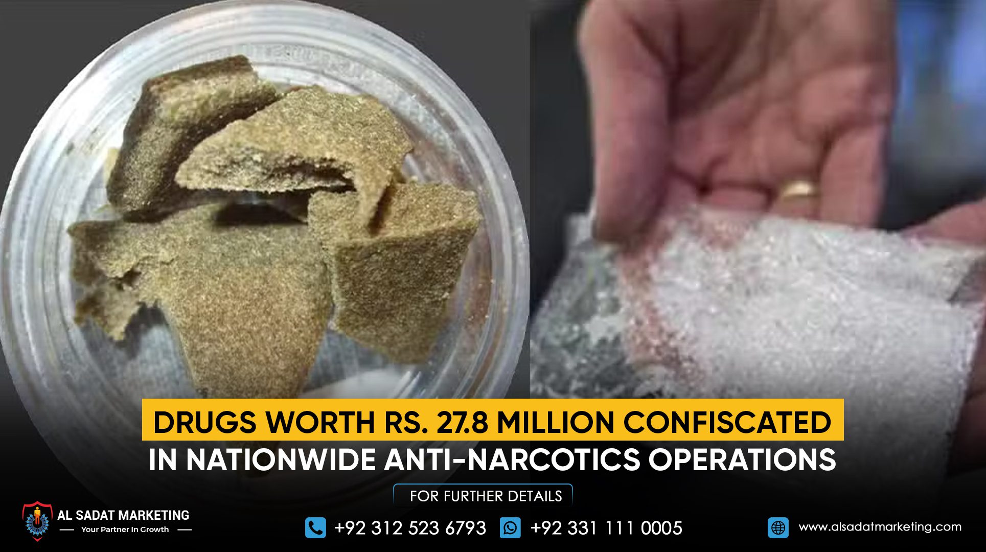The Anti-Narcotics Force (ANF) arrested six suspects and seized more than 520 kilograms of narcotics worth an estimated Rs. 27.9 million during seven operations carried out near educational institutions and in several cities, according to the Associated Press of Pakistan.