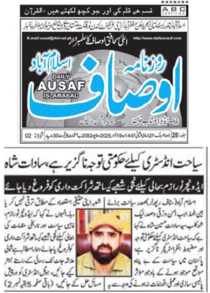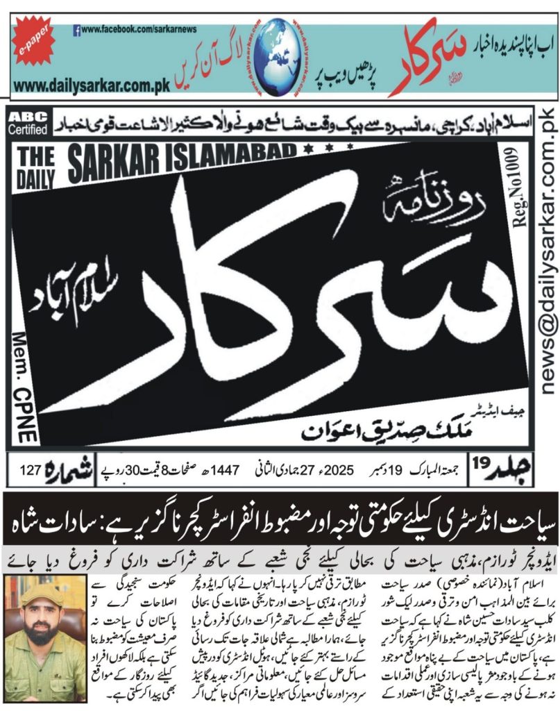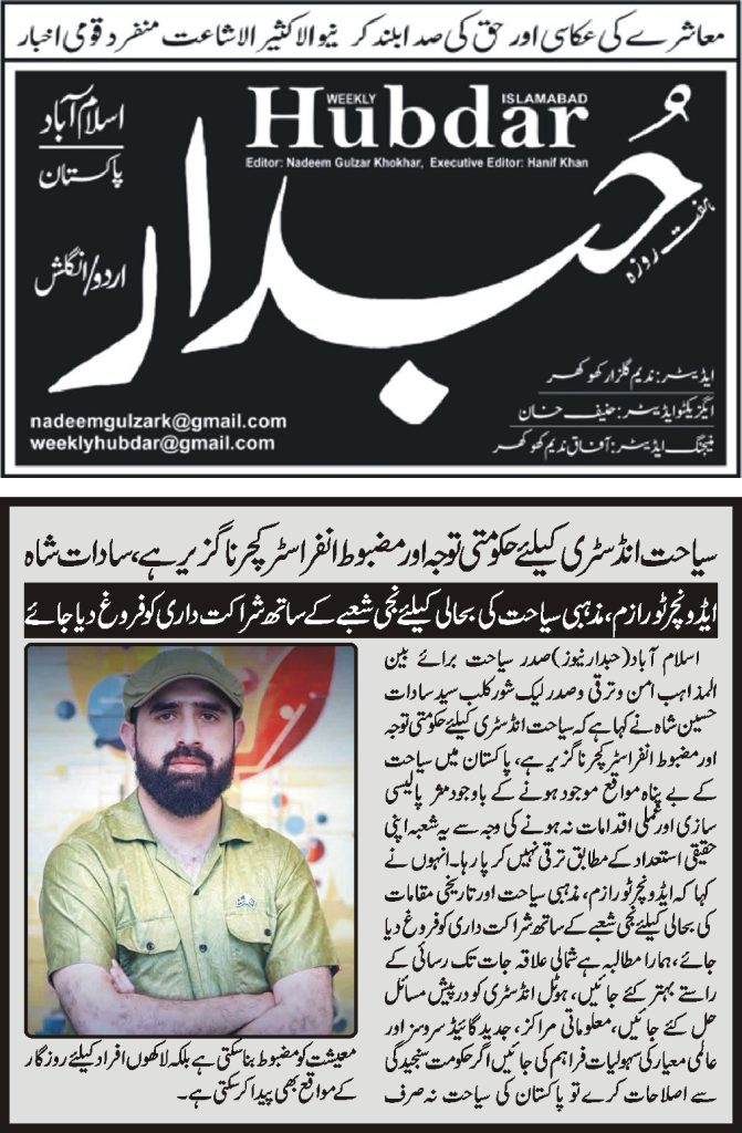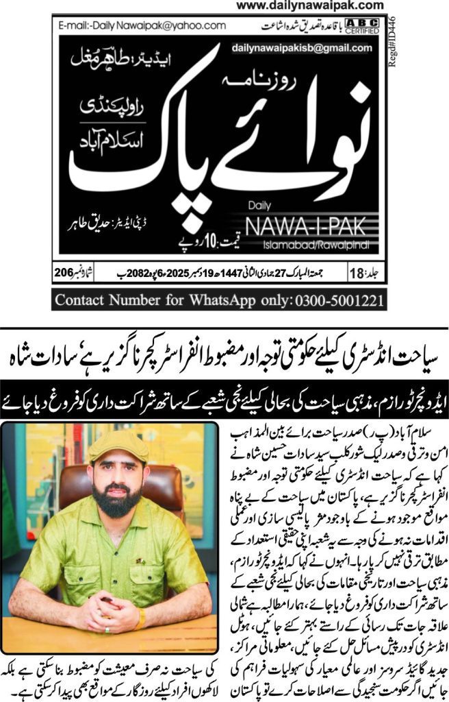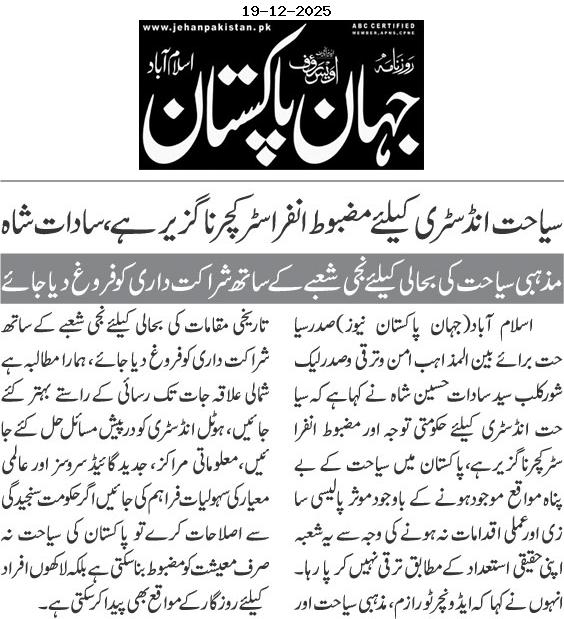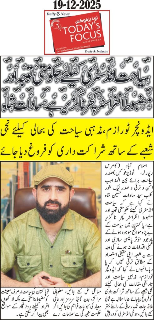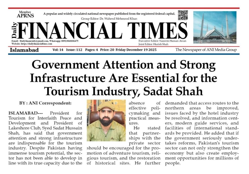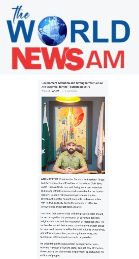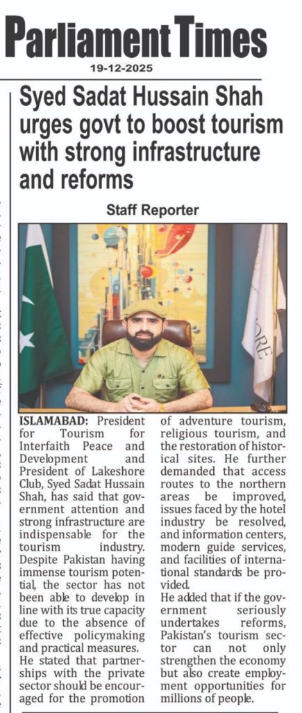 ISLAMABAD: President for Tourism for Interfaith Peace and Development and President of Lakeshore Club, Syed Sadat Hussain Shah, has said that government attention and strong infrastructure are indispensable for the tourism industry. Despite Pakistan having immense tourism potential, the sector has not been able to develop in line with its true capacity due to the absence of effective policymaking and practical measures.