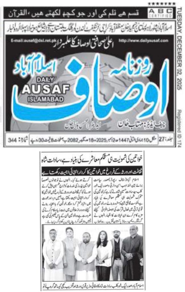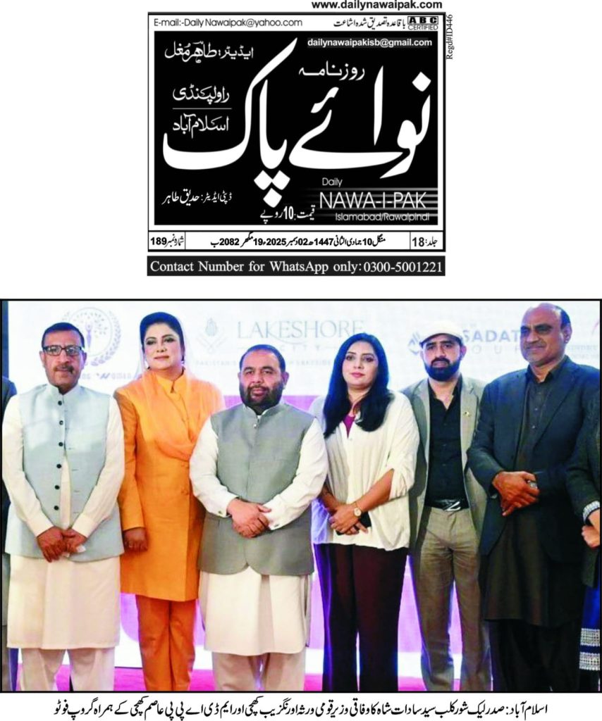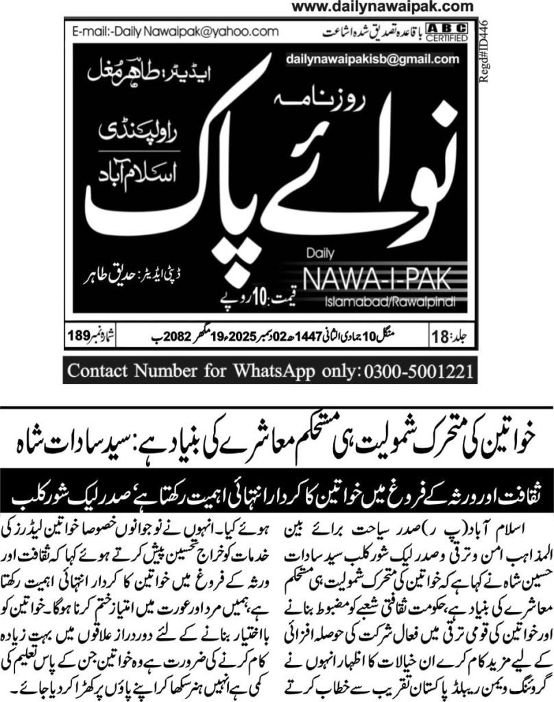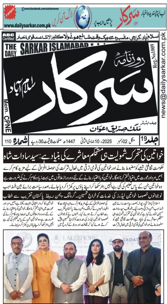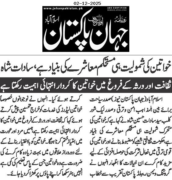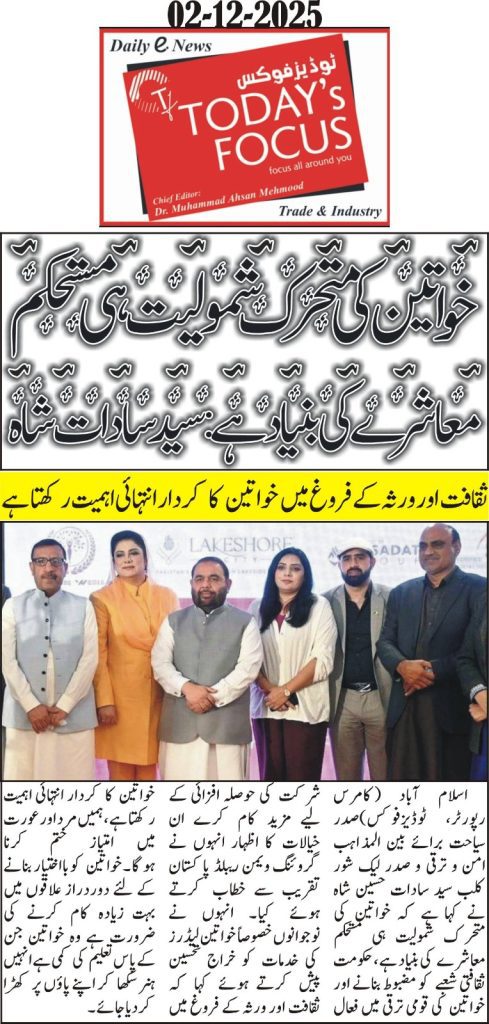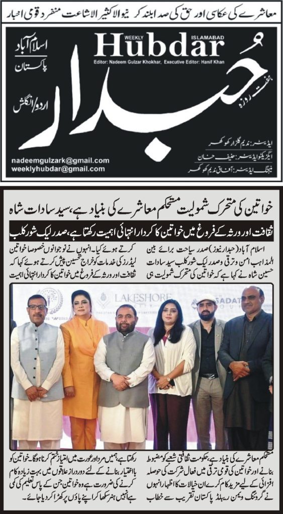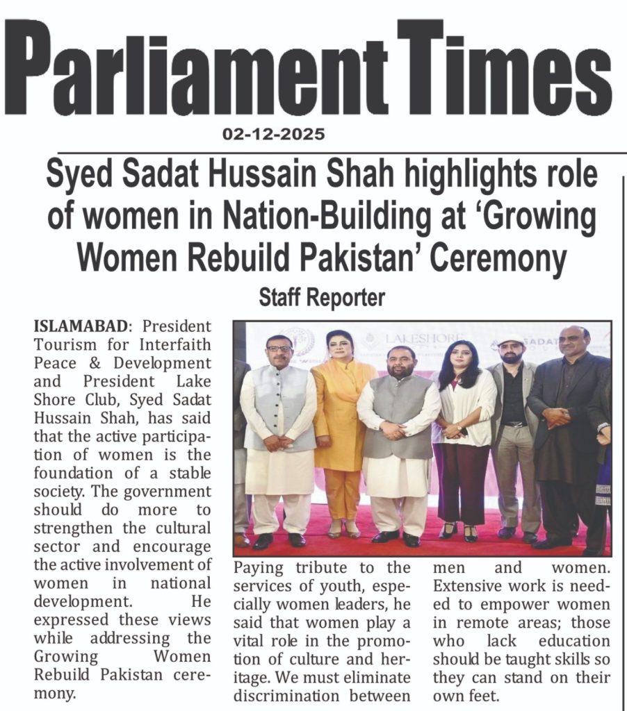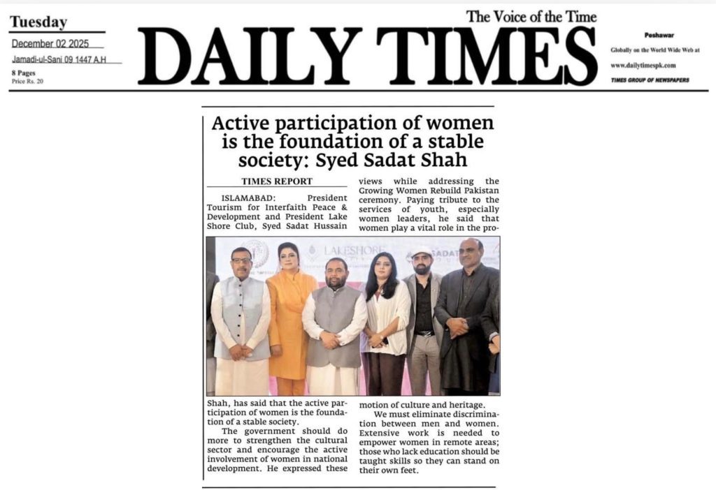 President of Tourism for Interfaith Peace & Development and President of Lakeshore City, Syed Sadat Hussain Shah, has emphasized that women’s active participation is essential for building a stable and progressive society. He stressed that the government must take stronger steps to uplift the cultural sector and encourage women’s involvement in national development.