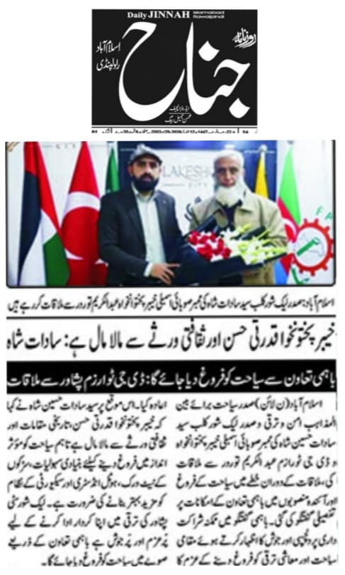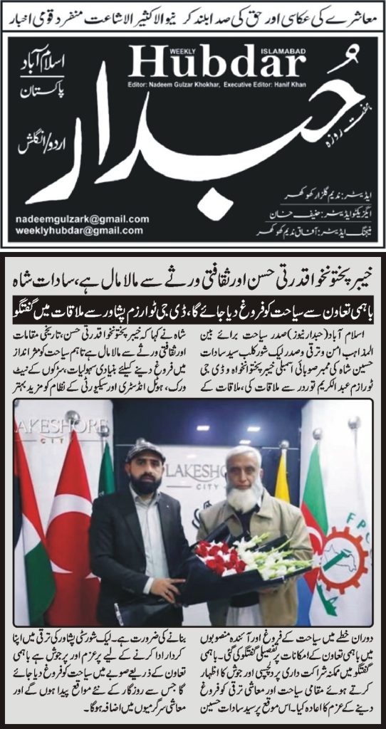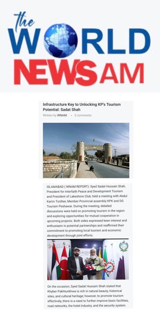 Syed Sadat Hussain Shah, President for Interfaith Peace and Development Tourism and President of Lakeshore Club, held a meeting with Abdul Karim Tordher, Member Provincial Assembly KPK and DG Tourism Peshawar. During the meeting, detailed discussions were held on promoting tourism in the region and exploring opportunities for mutual cooperation in upcoming projects. Both sides expressed keen interest and enthusiasm in potential partnerships and reaffirmed their commitment to promoting local tourism and economic development through joint efforts.