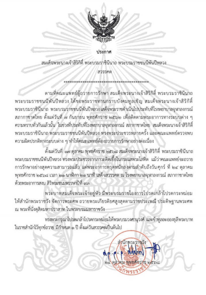 Thailand is mourning the death of Queen Mother Sirikit, the beloved widow of former King Bhumibol and mother of the current King Maha Vajiralongkorn. She passed away on Friday night at Chulalongkorn Hospital at the age of 93.