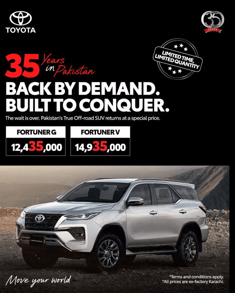 The promotion is part of Toyota’s broader celebrations marking 35 years of operations in Pakistan and is expected to attract SUV buyers looking for premium vehicles at reduced prices.